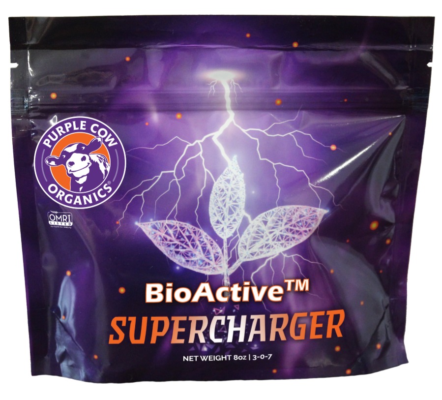 Purple Cow Veggie Supercharger does exactly what the name says: It supercharges your plants, providing them with living organisms and trace minerals to produce nutrient dense vegetables and fruits. When your plants are healthier, you are healthier. Not only does our Veggie Supercharger contain humates and kelp meal – which provide Nitrogen, Potassium, Calcium and other trace minerals – it utilizes mycorrhizal fungi – which are known to help with nutrient uptake at the roots. It is a soluble powder that is meant to be used in Purple Cow Compost Tea or water and is an easy-to-use way to feed your plants “immediately.” Bioactive Supercharger is a soluble fertilizing powder. Simply add a tablespoon to your watering can, tank, or backpack sprayer to add biology and trace minerals to your plants. Supercharger is an effective way to feed your plants “immediately” at the leaf surface in addition to the root system, and to see quick results! If you are looking to add some nutrients without adding them to your watering can, it can also be sprinkled over the soil and watered in. Bioactive Supercharger is a 3-0-7 fertilizer that contains calcium, humates, minerals, and more, and can be used on its own in water or partnered with liquid biologicals.